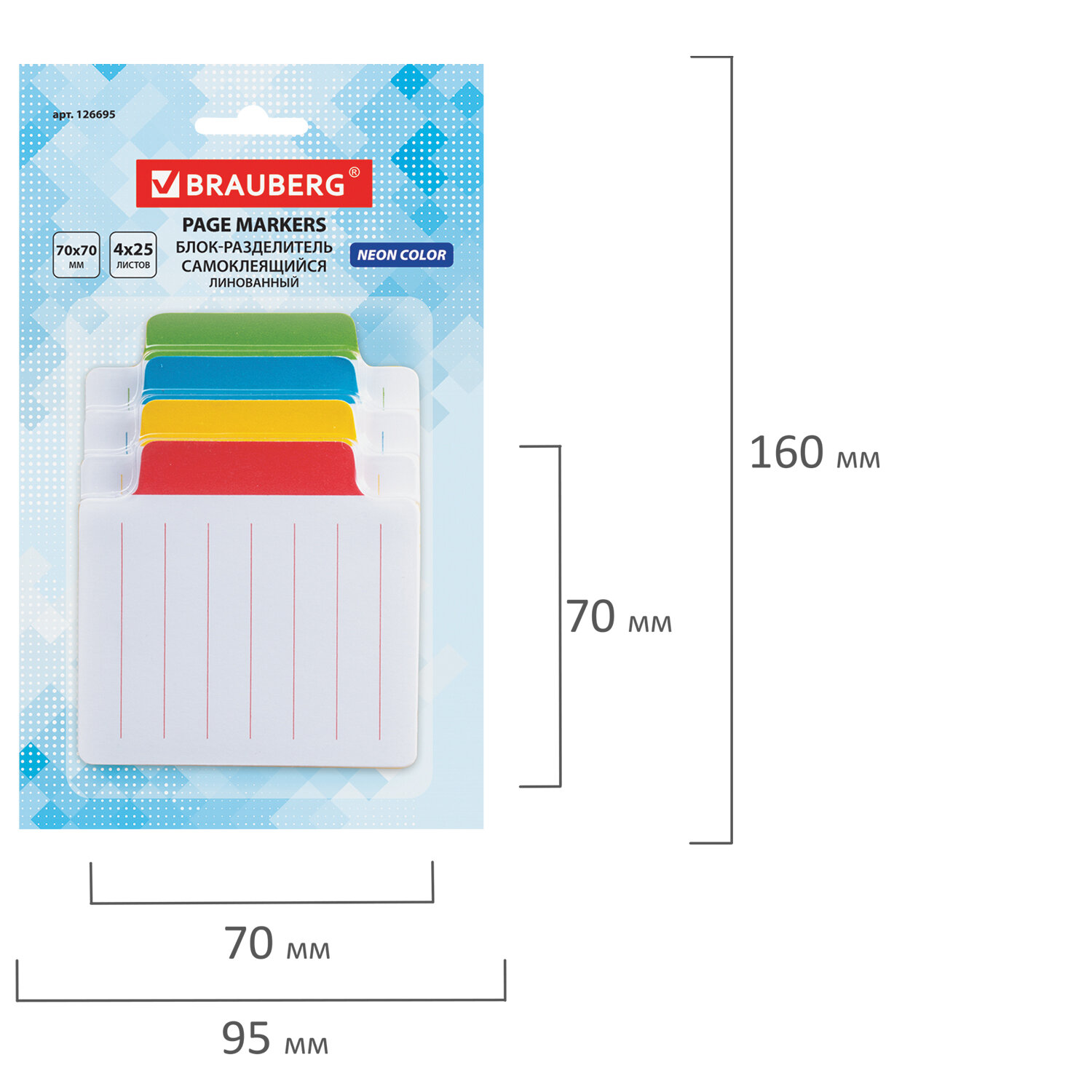 Блок-разделитель самоклеящийся (стикеры) BRAUBERG, ЛИНОВАННЫЙ, 70х70 мм, 4 цвета х 25 листов, ассорт