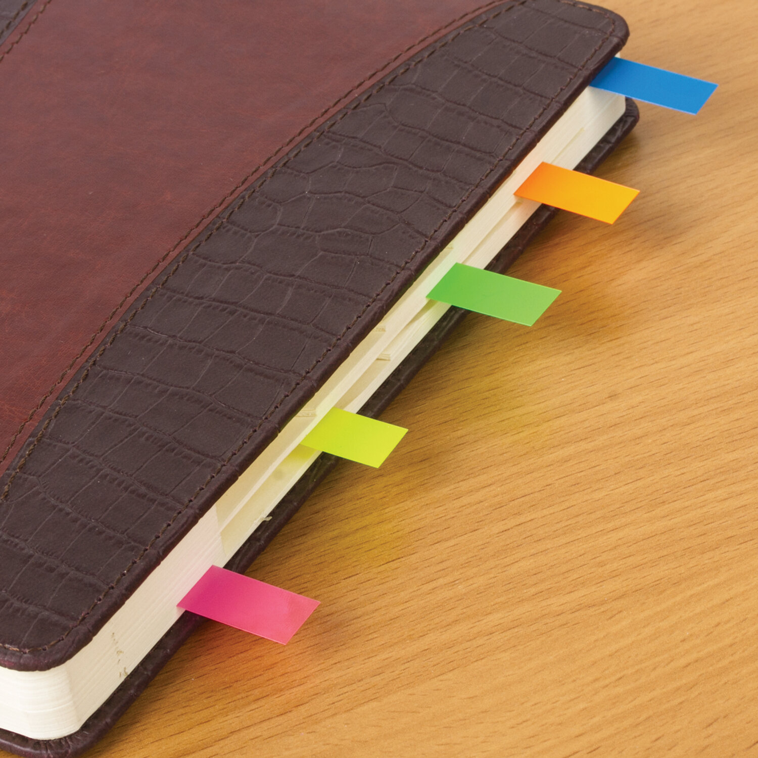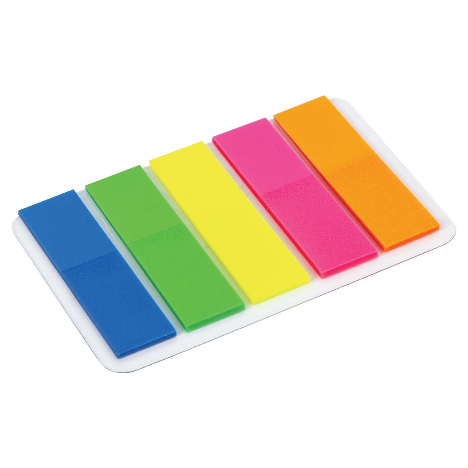 В наборе по 20 закладок каждого из 5 цветов. Размер закладки: 45х12 мм. Клейкий слой - 22 Н/м. Материал закладок позволяет делать на них надписи ручкой или карандашом. Поставляются в полиэтиленовом пакете с европодвесом.