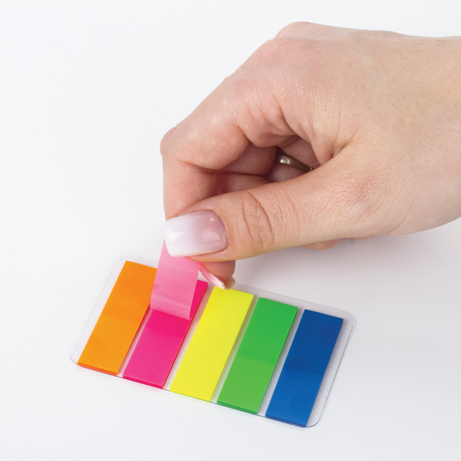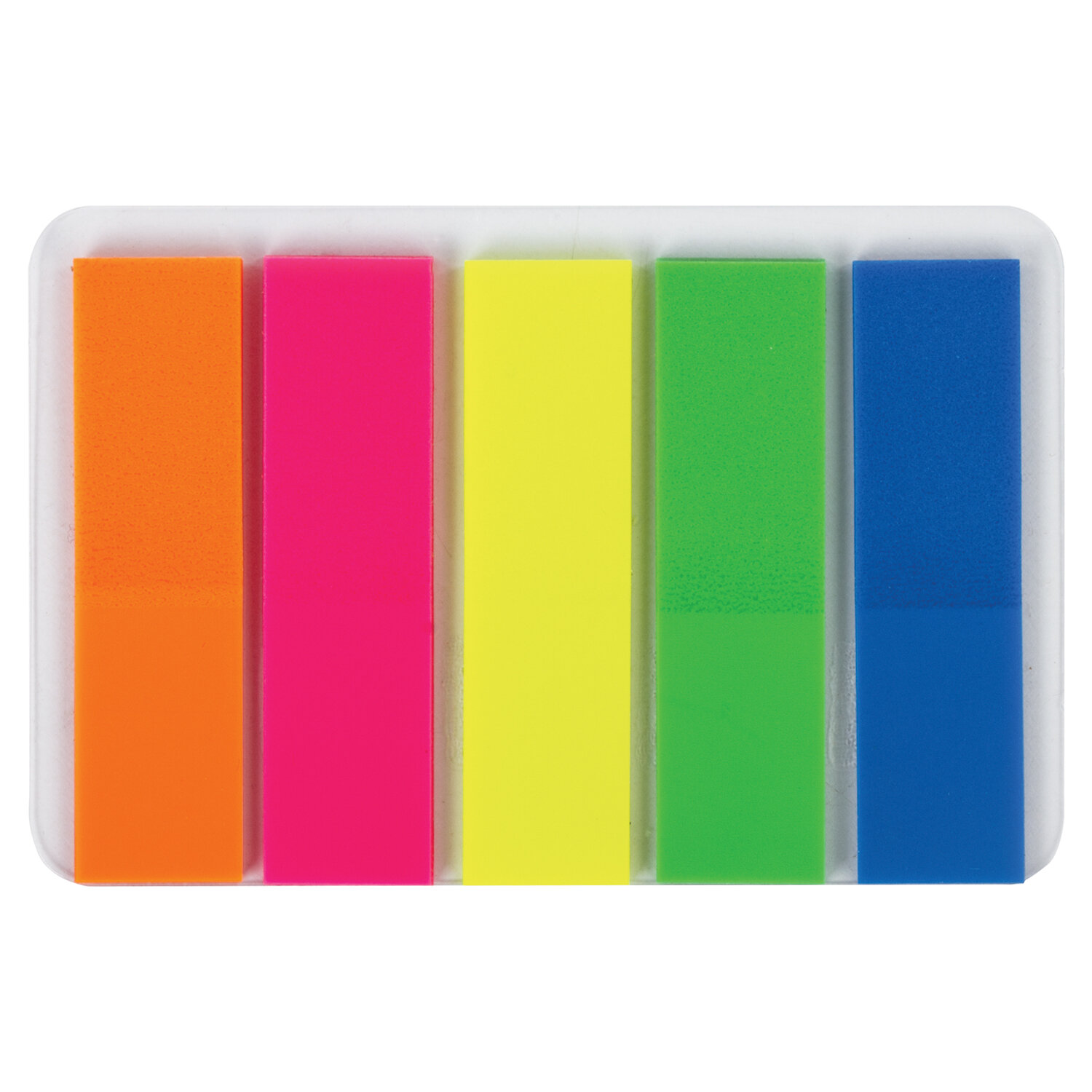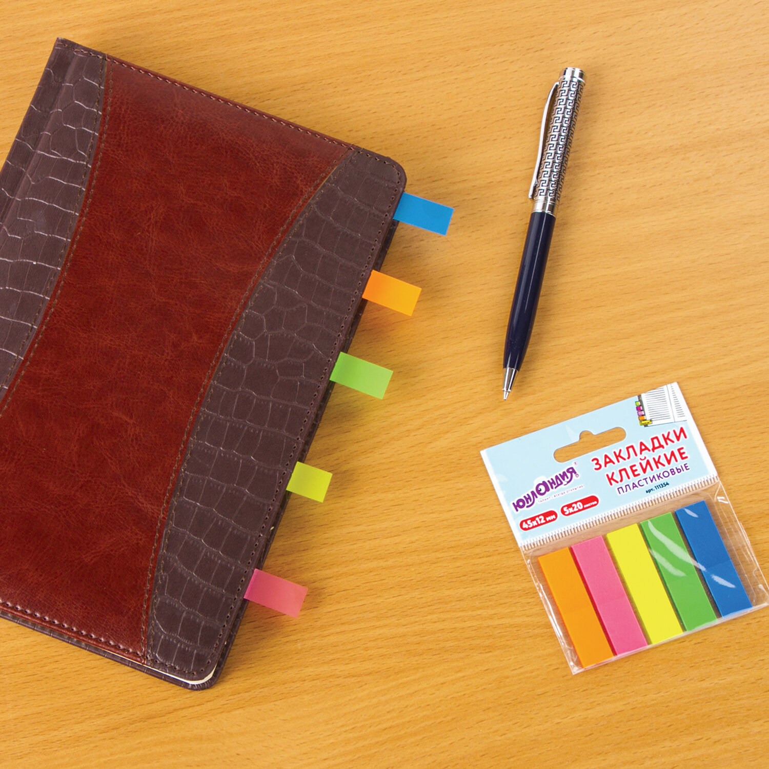 Закладки клейкие ЮНЛАНДИЯ НЕОНОВЫЕ, 45х12 мм, 5 цветов х 20 листов, в пластиковой книжке, 111354