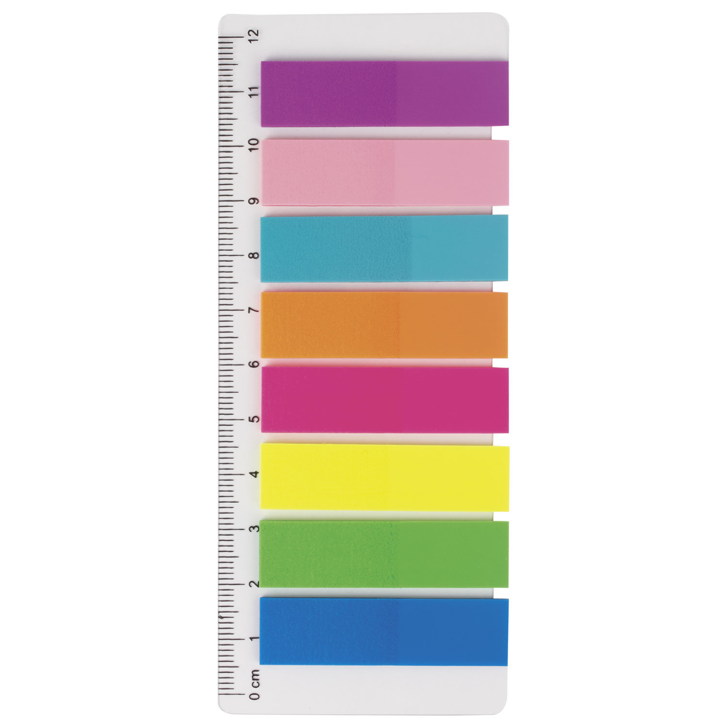 Набор пластиковых закладок 8 неоновых цветов размером 45х12 мм состоит из 200 листов, по 25 закладок каждого цвета. Клейкий слой - 22 Н/м. Легко клеятся к любой поверхности и не оставляют следов. Материал закладок позволяет делать надписи ручкой и карандашом. Уложены на пластиковой линейке длиной 12 см. Поставляются в полиэтиленовом пакете с европодвесом.