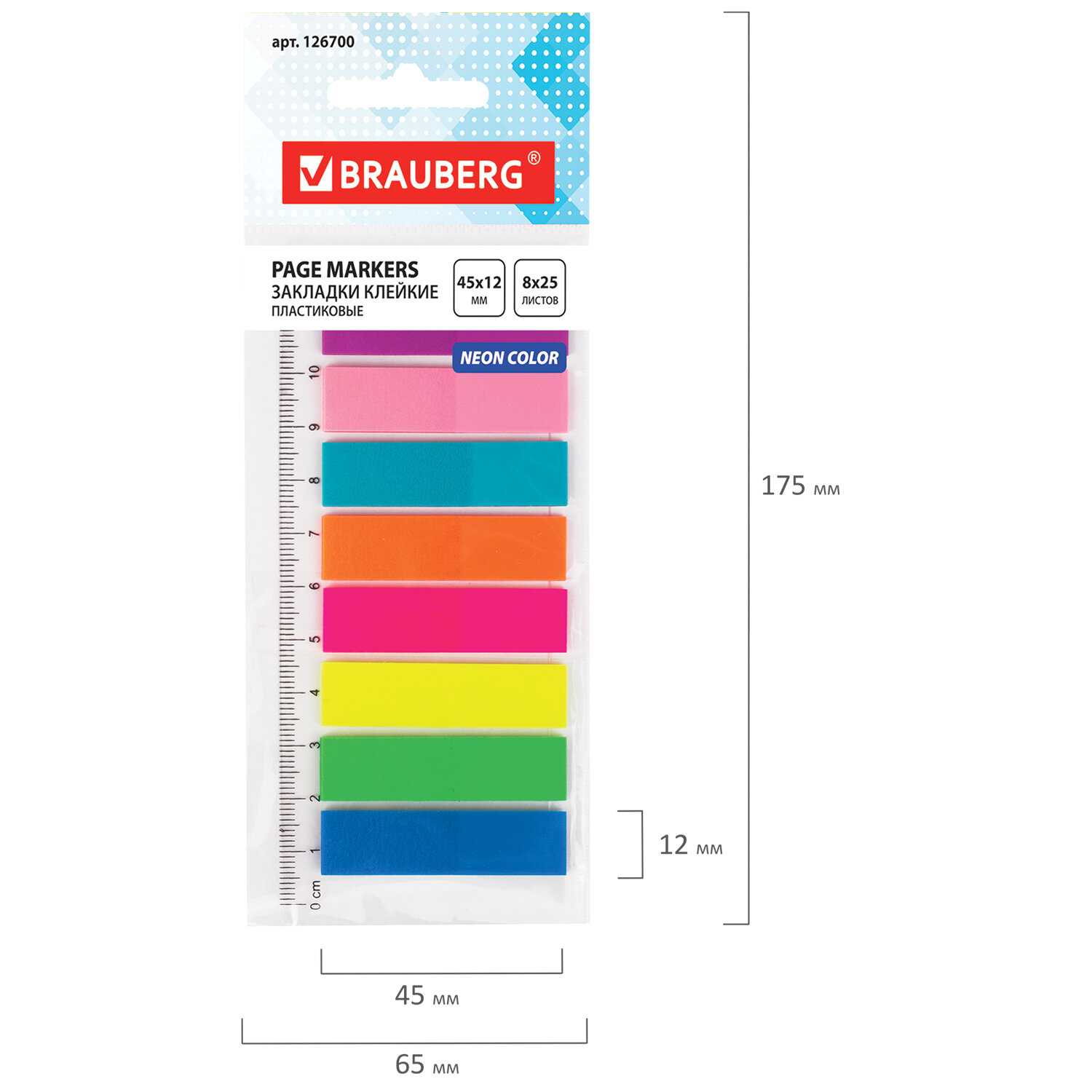Закладки клейкие BRAUBERG НЕОНОВЫЕ пластиковые, 45х12 мм, 8 цветов х 25 листов, на пластиковой линей
