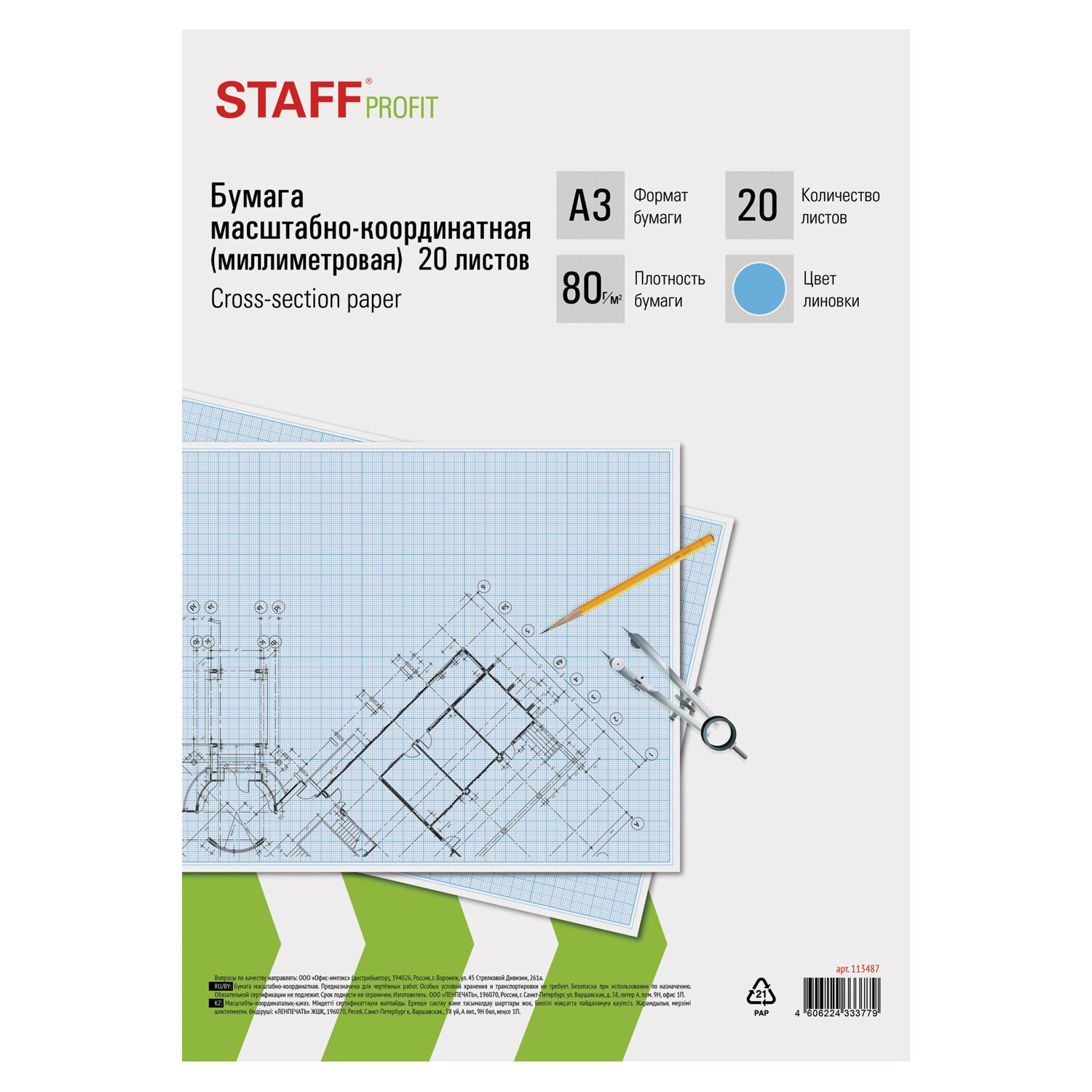Бумага формата А3 (297х420 мм) и плотностью 80 г/м2. Упакована в картонную папку по 20 листов. Цвет линовки - голубой. Отличается четкими линиями и точной миллиметровой разметкой.