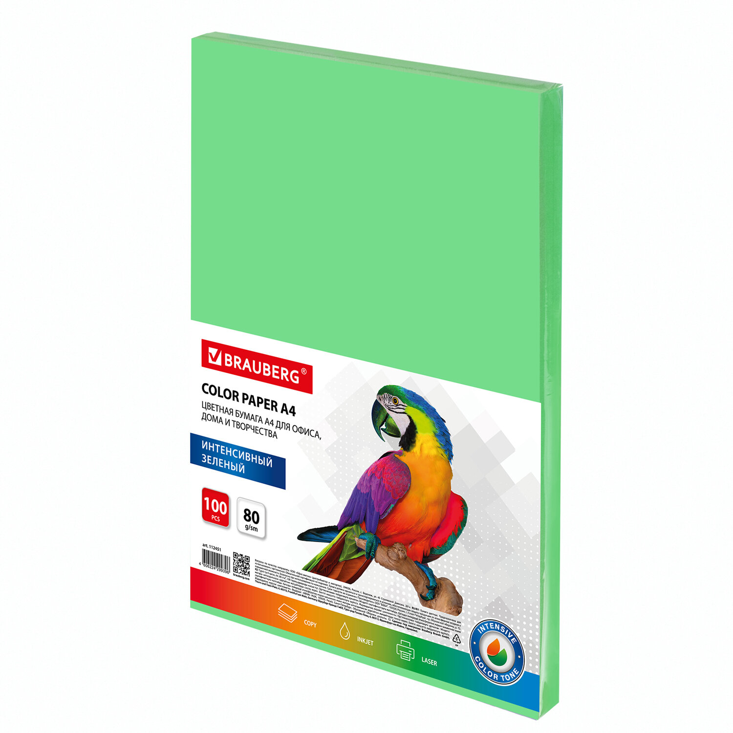 Бумага цветная BRAUBERG, А4, 80 г/м2, 100 л., интенсив, зеленая, для офисной техники, 112451
