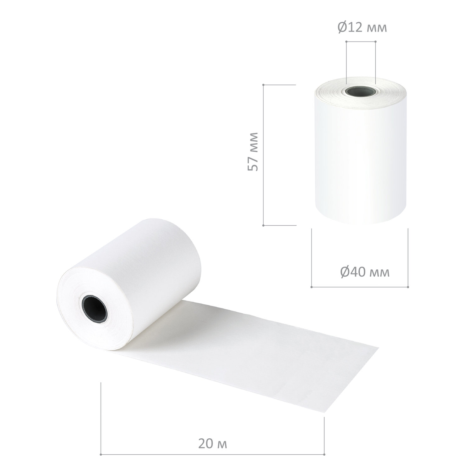 Чековая лента с наружным термослоем имеет ширину 57 мм и общую длину 20 м. Диаметр рулона варьируется от 40 до 43 мм, диаметр втулки - 12 мм. Плотность бумаги чековой ленты - 48 г/м2. Поставляется в термоусадочной пленке. 8 штук в комплекте.