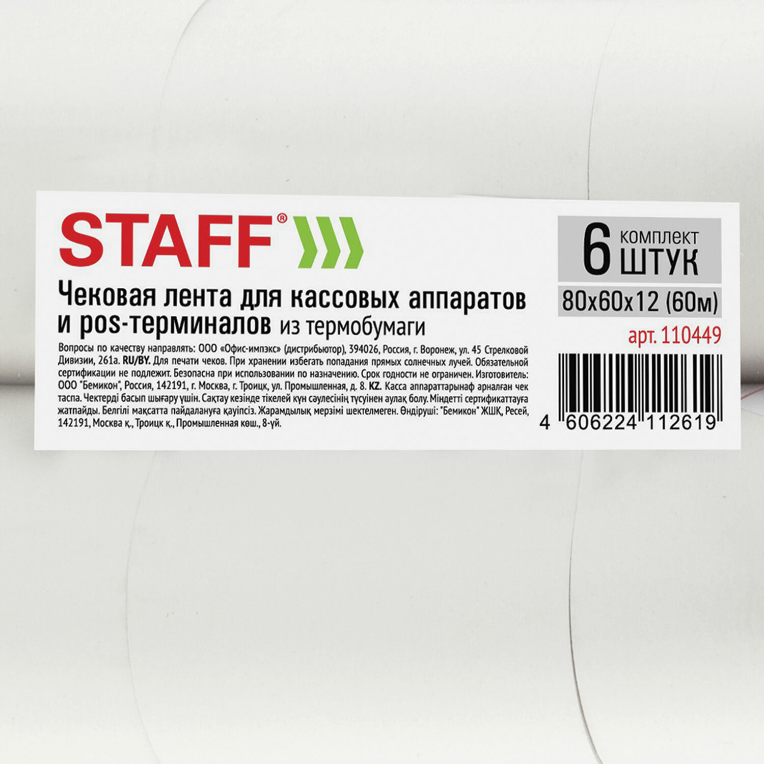 Чековая лента с наружным термослоем имеет ширину 80 мм и общую длину 60 м. Диаметр рулона - 66 мм, диаметр втулки - 12 мм. Плотность бумаги чековой ленты - 48 г/м2. Поставляется в термоусадочной пленке. 6 штук в комплекте.