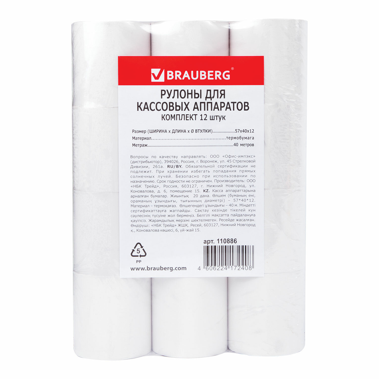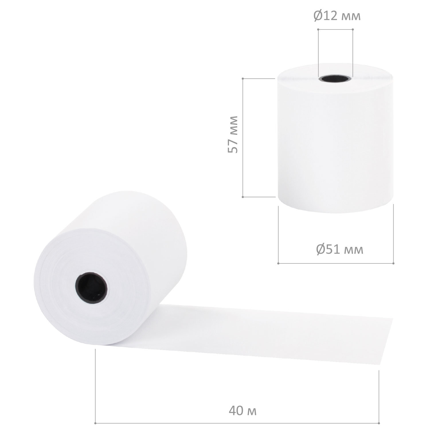 Чековая лента ТЕРМОБУМАГА 57 мм (диаметр 51 мм, длина 40 м, втулка 12 мм) КОМПЛЕКТ 12 шт., BRAUBERG,