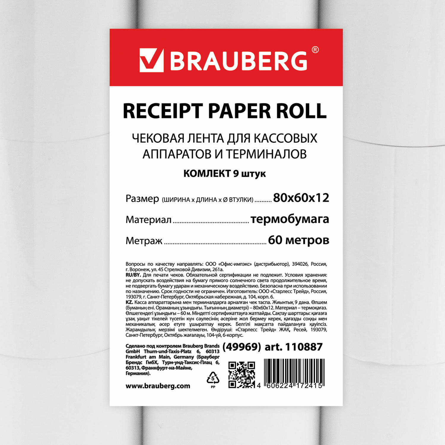 Чековая лента ТЕРМОБУМАГА 80 мм (диаметр 63 мм, длина 60 м, втулка 12 мм) КОМПЛЕКТ 9 шт., BRAUBERG,