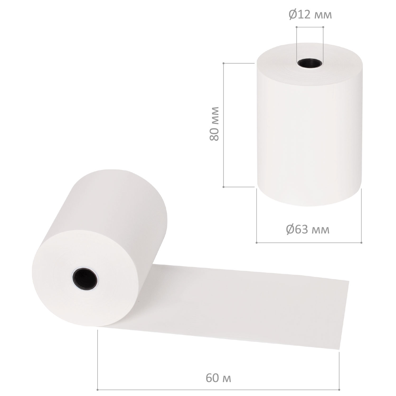 Cостоит из бумажной основы с нанесением на неё термочувствительного химического состава. Рулоны изготовлены на современном оборудовании, обеспечивающем ровную намотку и отсутствие бумажной пыли. Позволяют получить печать высокого качества и продлевают срок службы оргтехники. Чековая лента с наружным термослоем имеет ширину 80 мм и общую длину 60 м. Диаметр рулона - 63 мм, диаметр втулки - 12 мм. Плотность бумаги чековой ленты - 48 г/м2. Поставляется в термоусадочной пленке. 9 штук в комплекте.