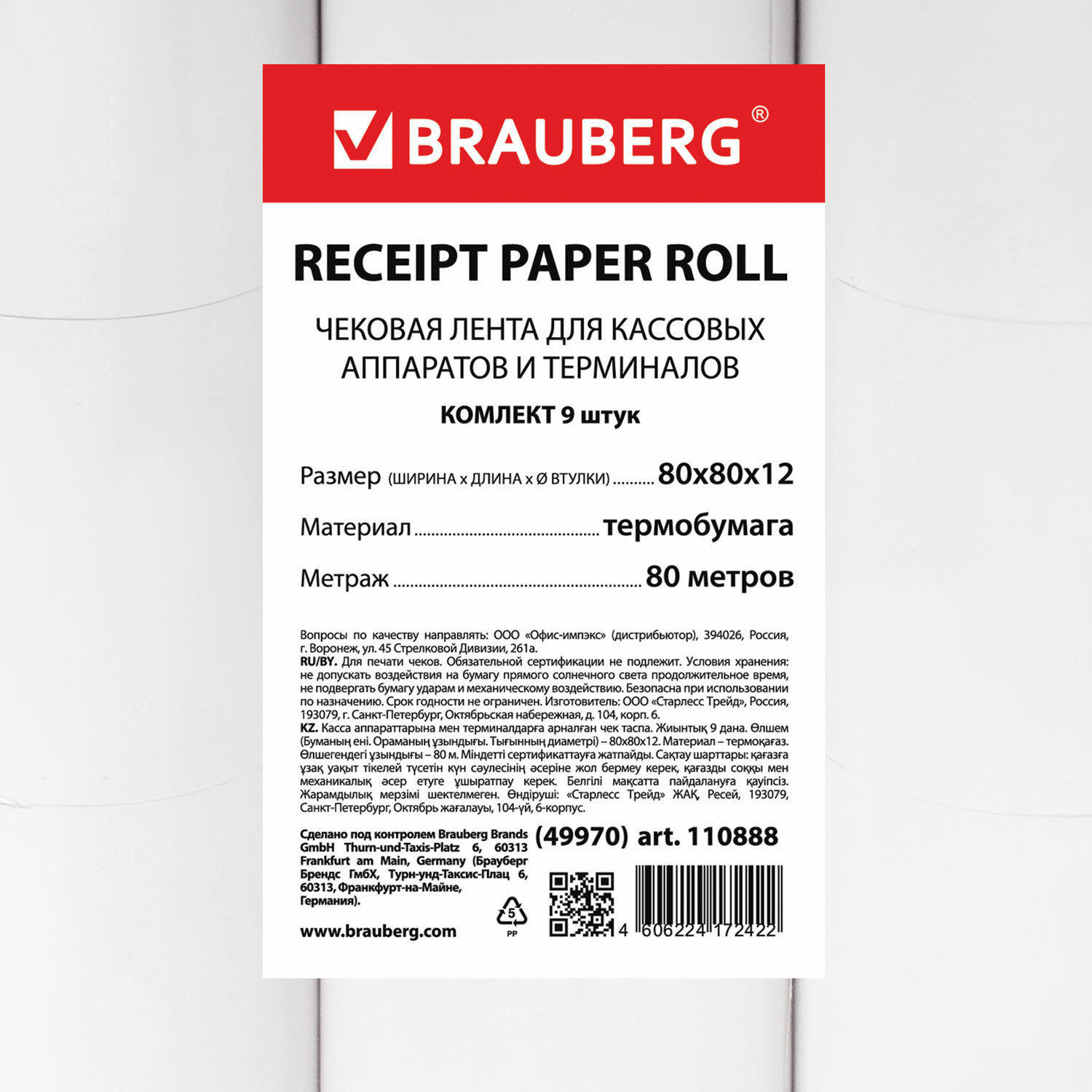 Чековая лента ТЕРМОБУМАГА 80 мм (диаметр 72 мм, длина 80 м, втулка 12 мм) КОМПЛЕКТ 9 шт., BRAUBERG,