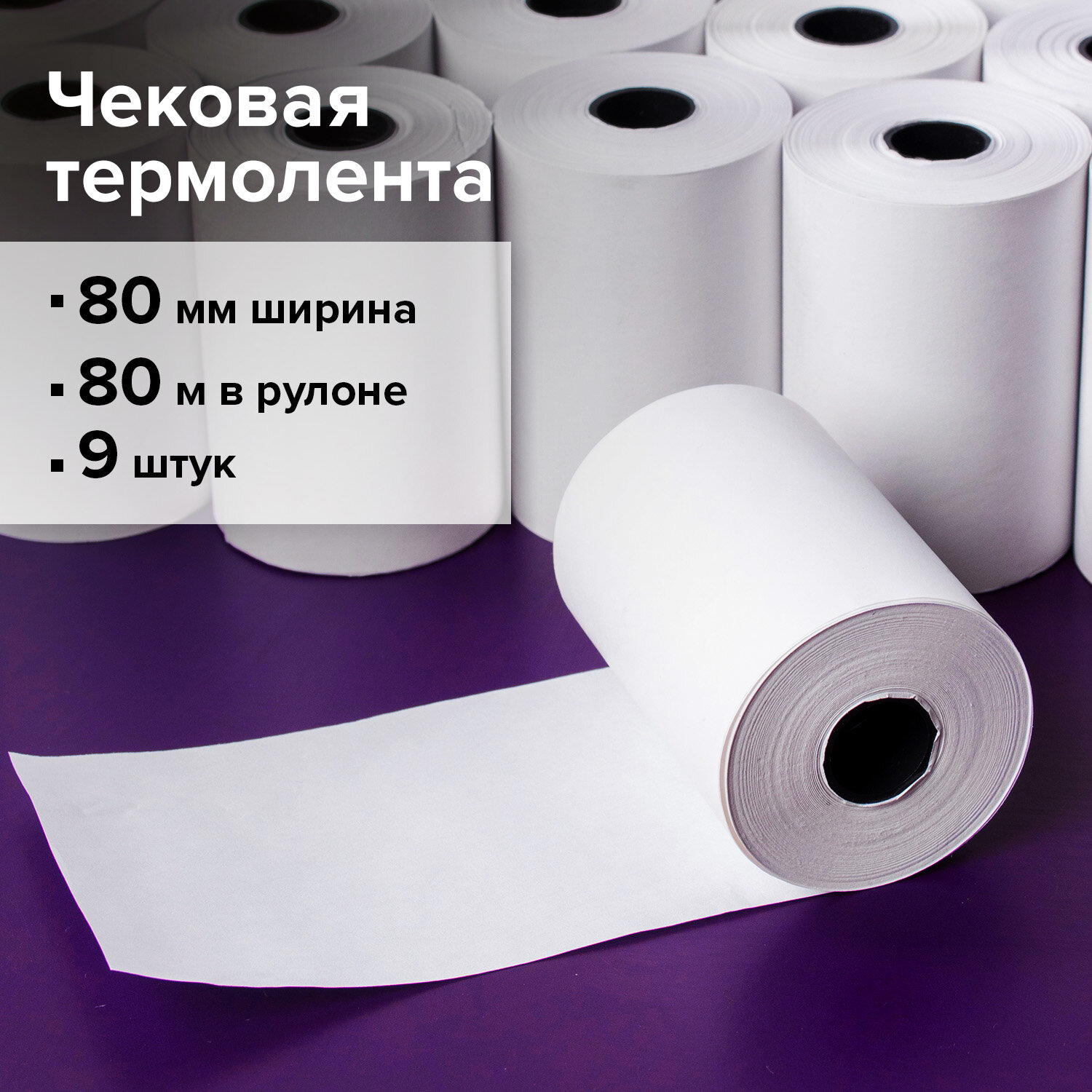Cостоит из бумажной основы с нанесением на неё термочувствительного химического состава. Рулоны изготовлены на современном оборудовании, обеспечивающем ровную намотку и отсутствие бумажной пыли. Позволяют получить печать высокого качества и продлевают срок службы оргтехники. Чековая лента с наружным термослоем имеет ширину 80 мм и общую длину 80 м. Диаметр рулона - 72 мм, диаметр втулки - 12 мм. Плотность бумаги чековой ленты - 48 г/м2. Поставляется в термоусадочной пленке. 9 штук в комплекте.