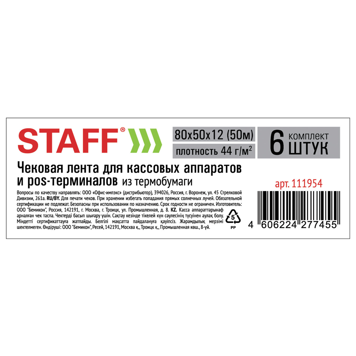 Чековая лента с наружным термослоем имеет ширину 80 мм и общую длину 50 м. Диаметр рулона варьируется от 56 мм до 65 мм, диаметр втулки - 12 мм. Плотность бумаги чековой ленты - 44 г/м2. Поставляется в термоусадочной пленке. 6 штук в комплекте.