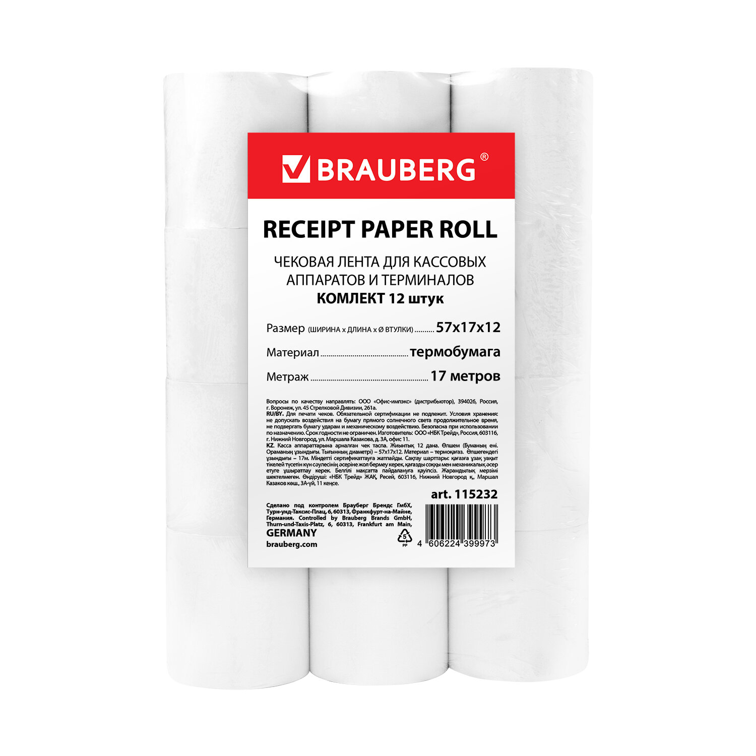 Чековая лента ТЕРМОБУМАГА 57мм (диаметр 35мм, длина 17м, втулка 12мм) КОМПЛЕКТ 12шт, BRAUBERG 115232