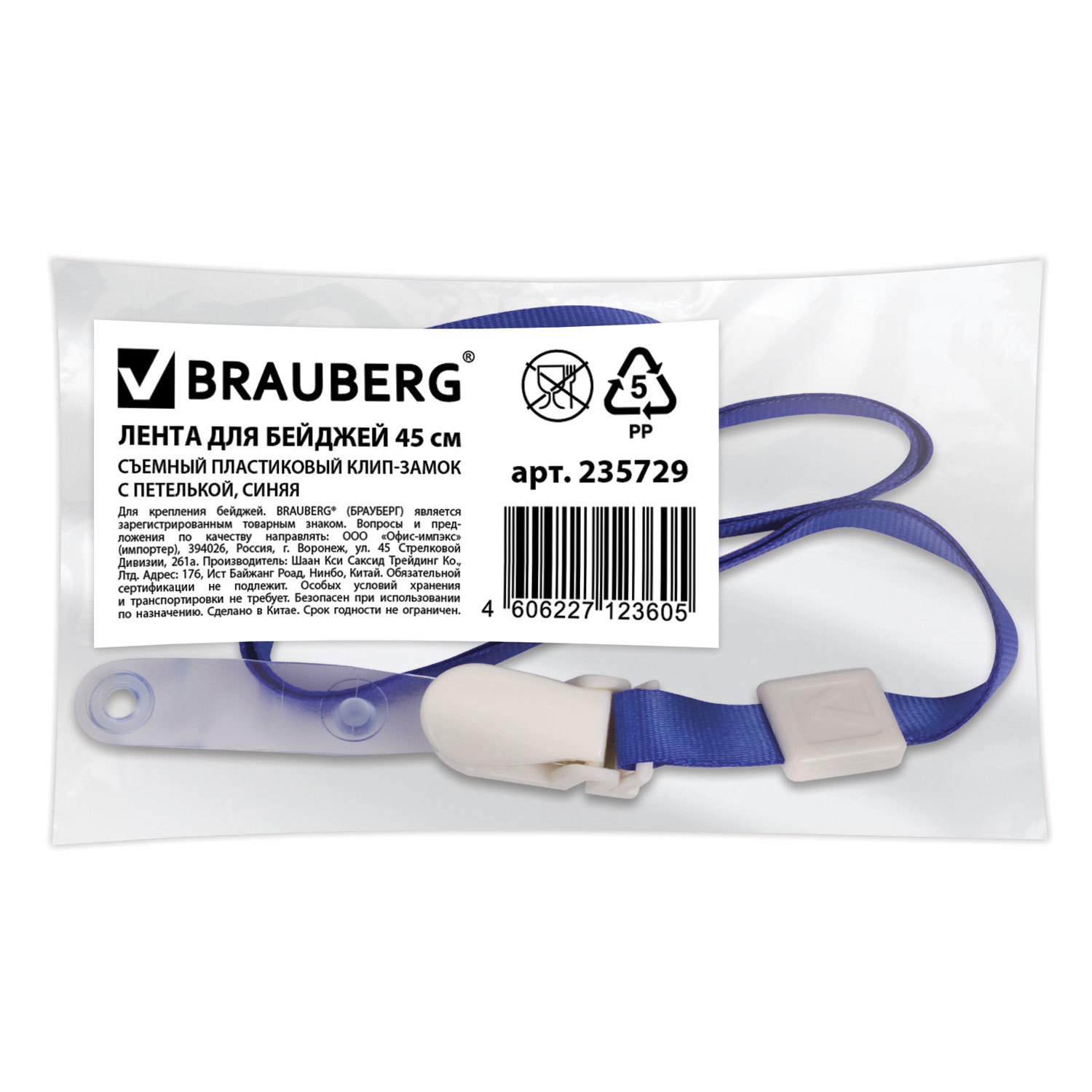 Лента для бейджей, 45 см, съемный пластиковый клип-замок с петелькой, СИНЯЯ, BRAUBERG, 235729