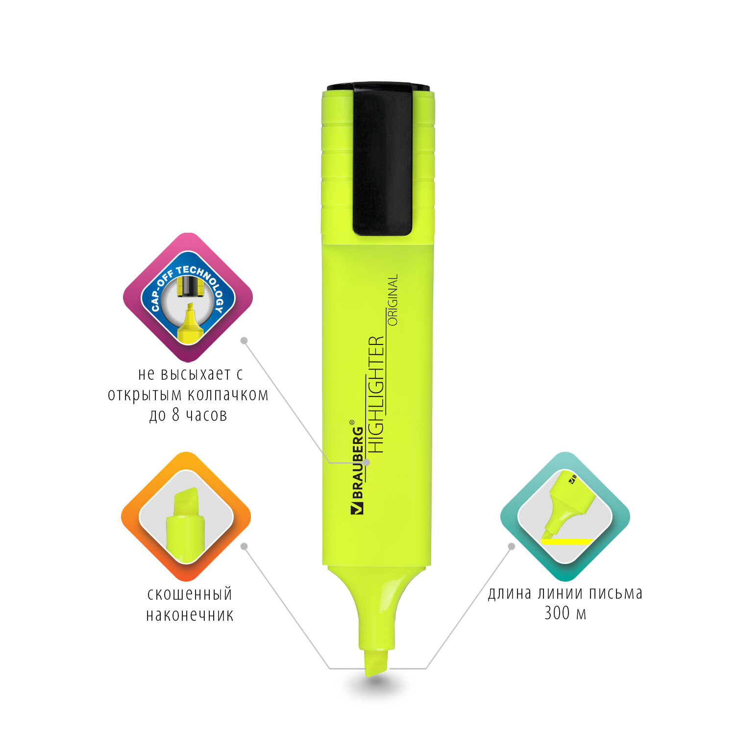 4 цвета в наборе: желтый, оранжевый, розовый и зеленый. Текстовыделители имеют плоскую форму корпуса, диаметр которого 25 мм. Скошенный наконечник имеет толщину линии письма от 1 до 5 мм, что обеспечивает удобство при работе с текстом, напечатанным мелким шрифтом, или таблицами. Чернила с неоновым эффектом обеспечивают неповторимую яркость выделения текста. Благодаря особой водной основе чернил текстовыделители не высыхают без колпачка в течение 8 часов. Текстовыделители обладают экономным расходом чернил, при этом длина линии письма достигает 300 метров. Чернила быстро впитываются и тем самым предотвращают размазывание в процессе использования. Светоустойчивые чернила не выцветают даже на открытом солнце. Цвет корпуса и колпачка соответствует цвету чернил.