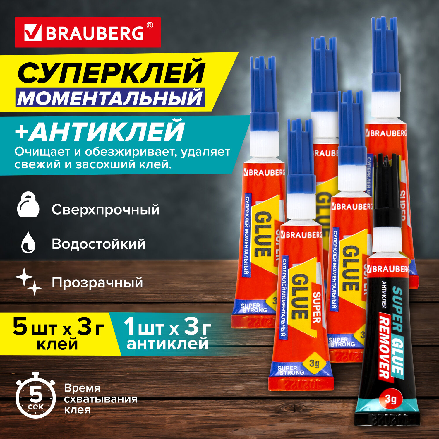 Клей моментальный Суперклей 5 шт. по 3 г + "Антиклей" в подарок, BRAUBERG EXTRA, 608107