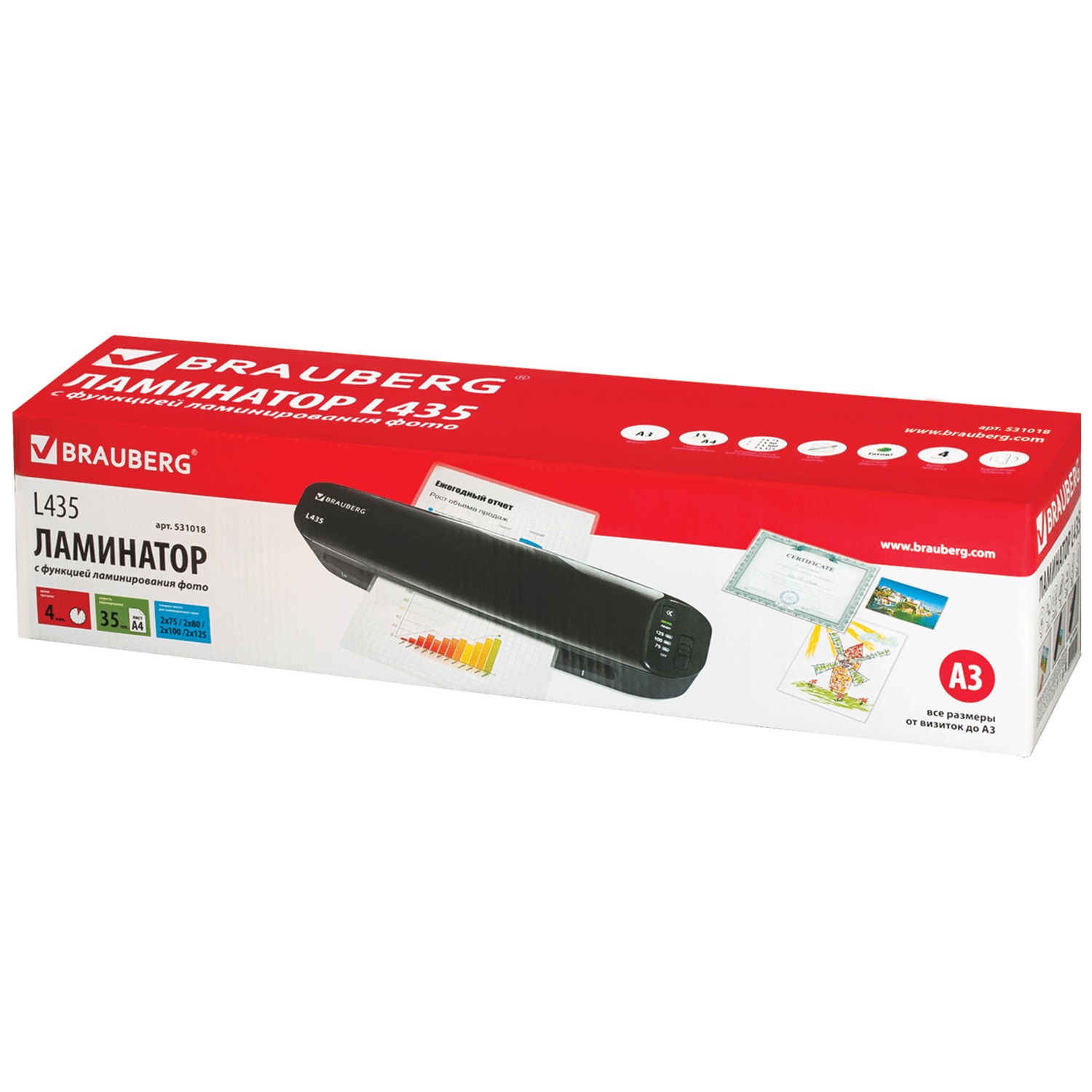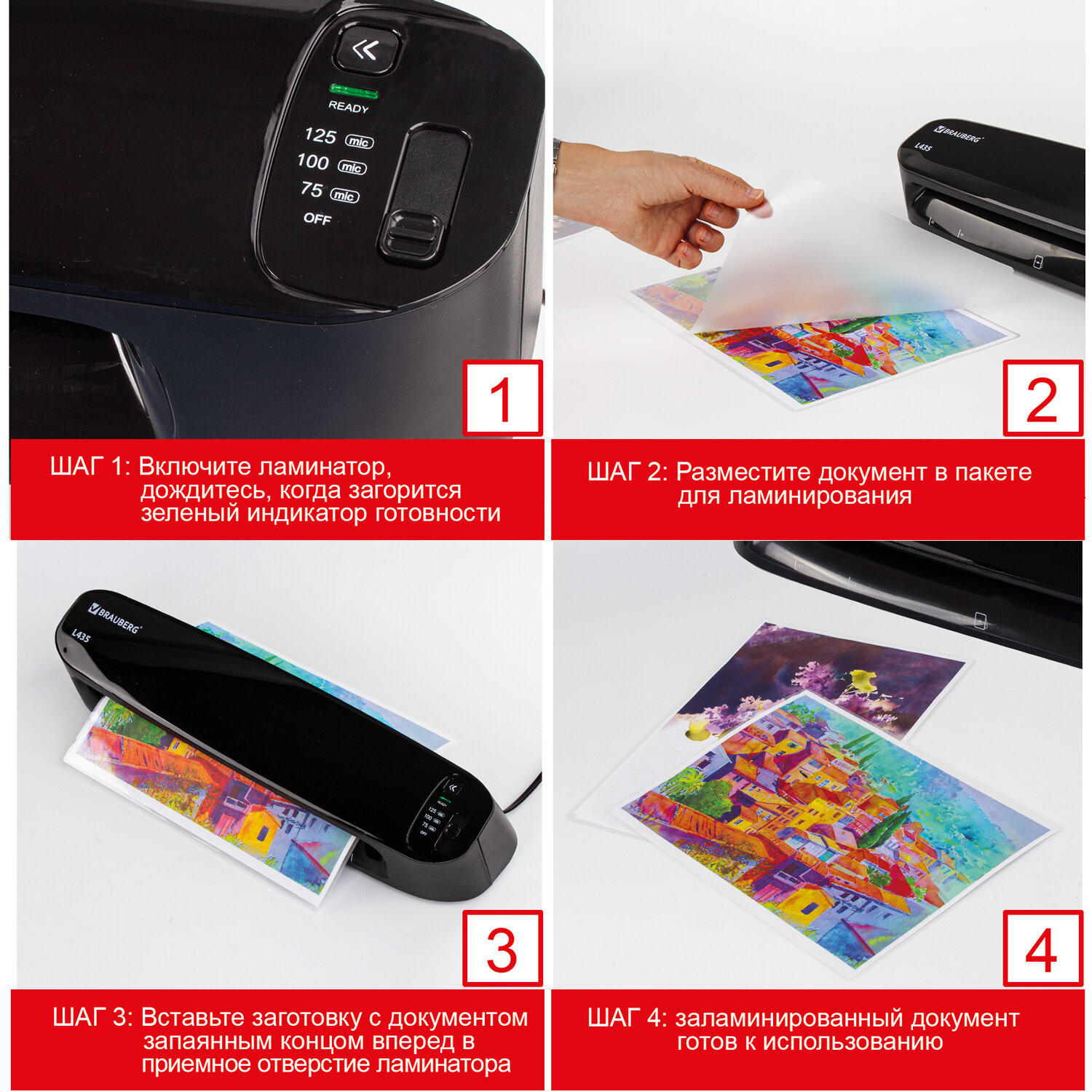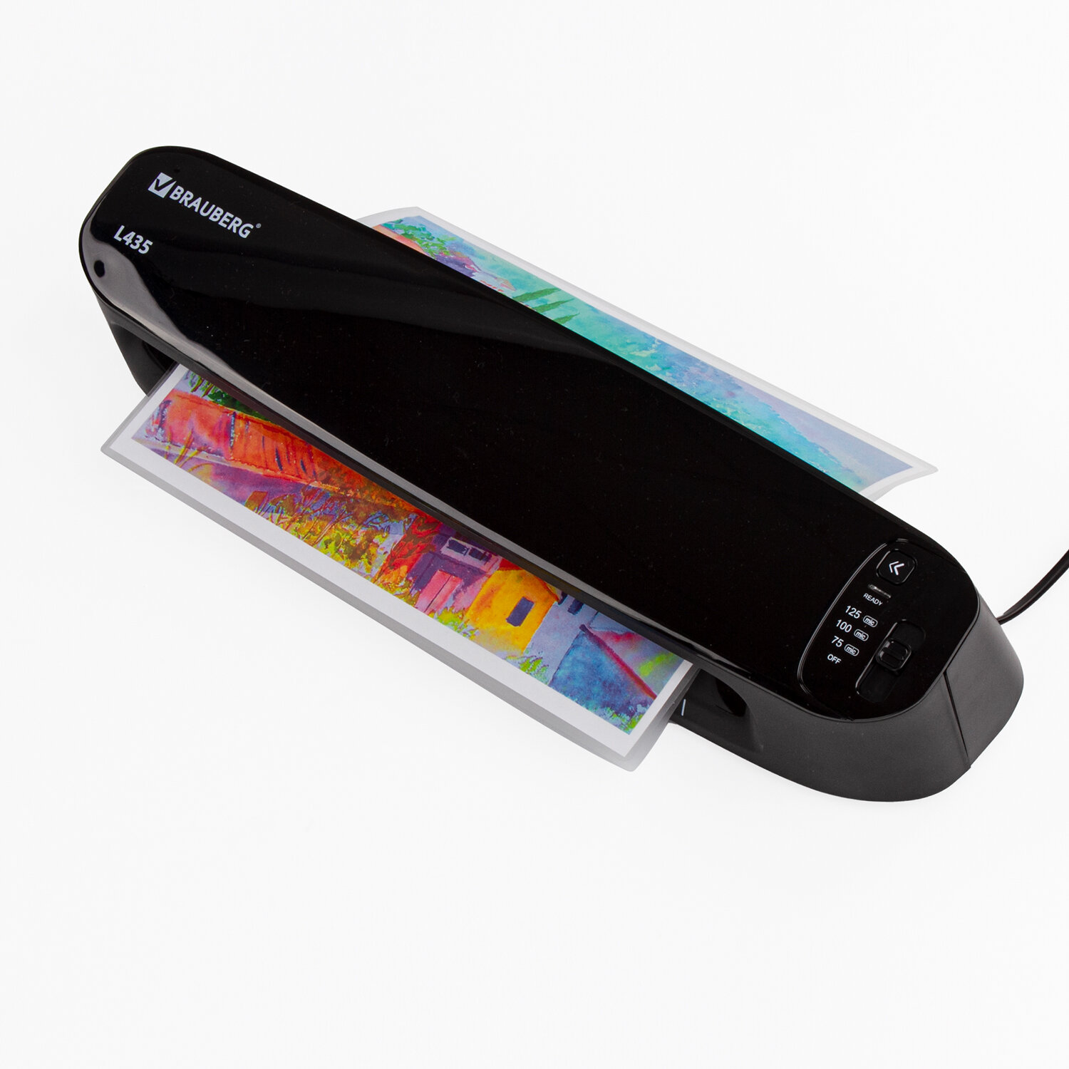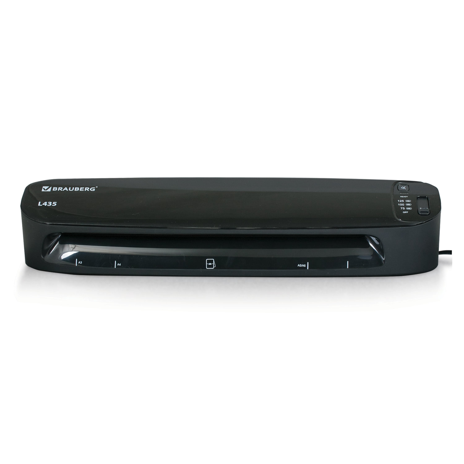 Способен заламинировать документы различных размеров от визитки до листа формата А3. Ламинирует 1 документ формата А4 в пакетах 2x75, 2x80, 2x100 и 2х125 мкм примерно за 35 секунд (!). Функция антизамятия реализуется кнопкой реверса, которая позволяет комфортно извлечь замятый документ - при нажатии кнопки реверса возврат документа осуществляется в результате реверсивного движения валов ламинатора, т.е. пользователю не нужно тянуть замятый лист рукой. Аудиосигнал готовности ламинатора позволяет узнать о том, что ламинатор прогрет и готов к использованию, т.е. пользователю нет необходимости стоять у ламинатора, ожидая, пока он прогреется. В это время он может заниматься другими делами. На готовность ламинатора к использованию также укажет световой индикатор, который загорится зеленым. Глянцевая поверхность придает особую привлекательность ламинатору BRAUBERG L435, который не просто впишется в любой интерьер, а украсит его.
