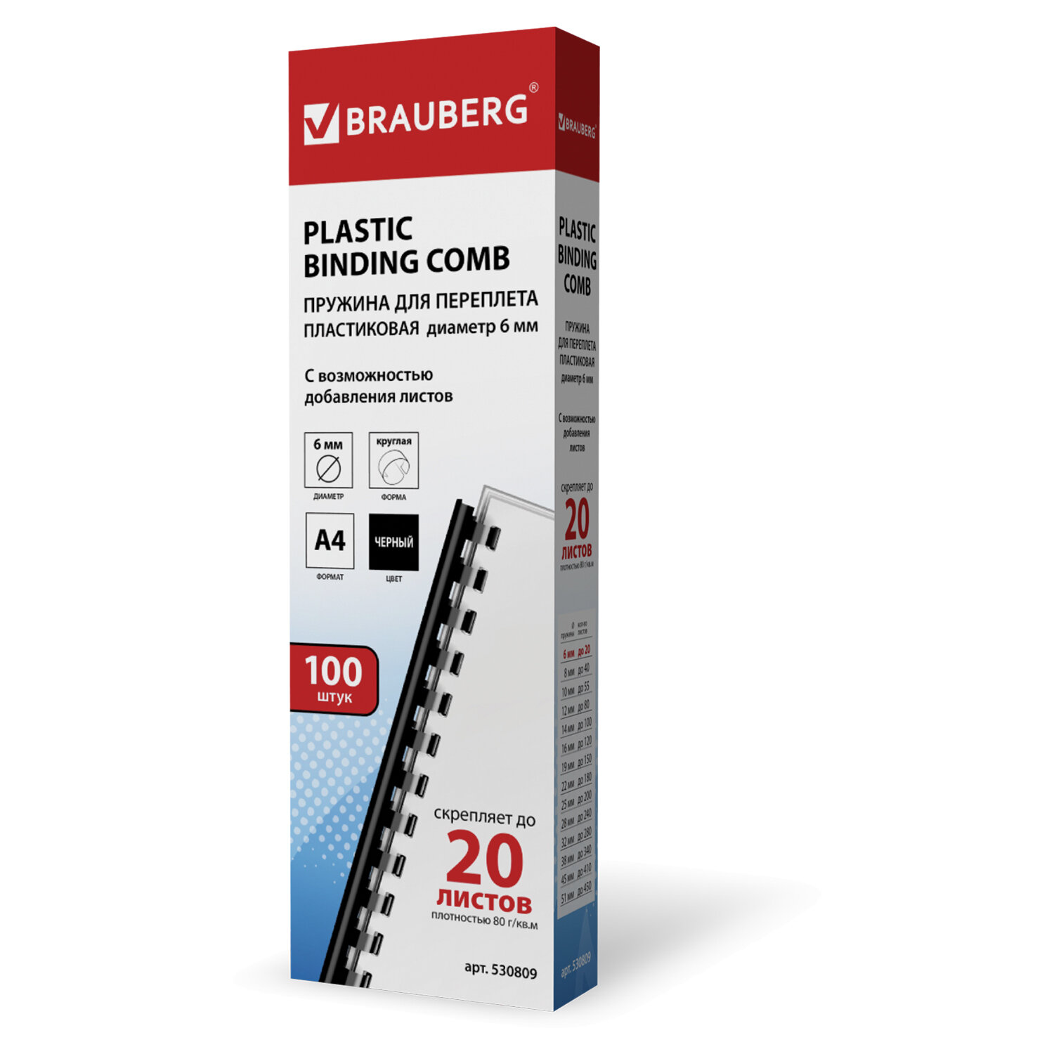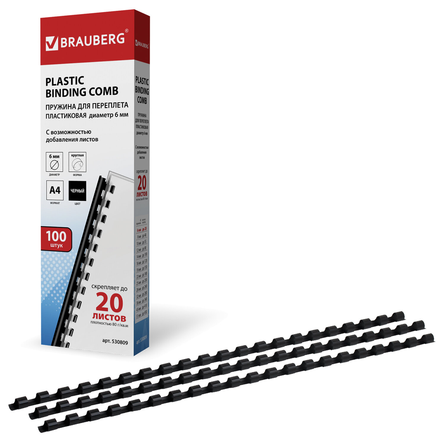 Пружины пластиковые для переплета, КОМПЛЕКТ 100 шт., 6 мм (для сшивания 10-20 л.), черные, BRAUBERG,