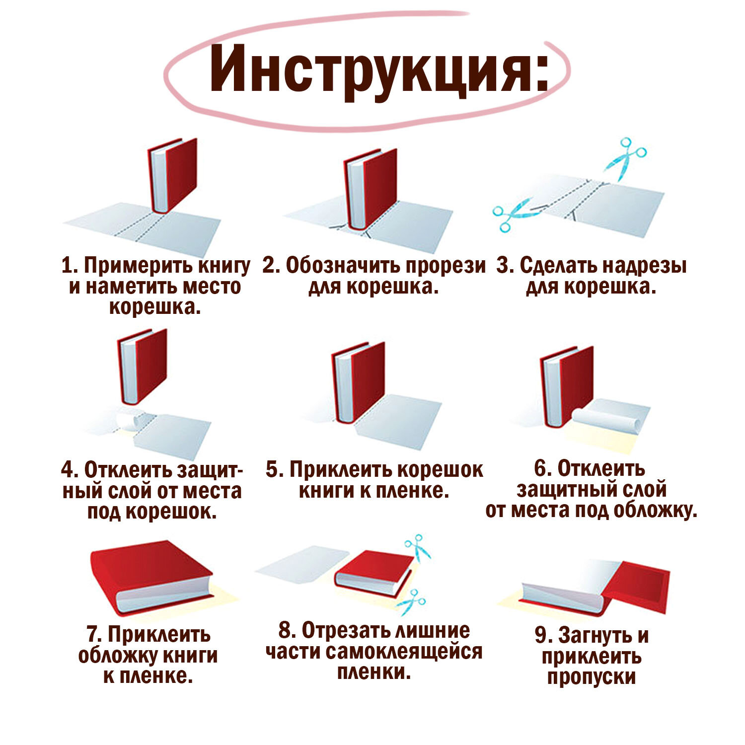 Изготовлена из прозрачного полипропилена толщиной 80 мкм. Подходит для любых форматов. Имеет глянцевый блеск. Рулон шириной 45 см и длиной 100 см.Инструкция по применению:1. Примерить книгу и наметить место корешка.2. Обозначить прорези для корешка. 3. Сделать надрезы для корешка.4. Отклеить защитный слой от места под корешок.5. Приклеить корешок книги к пленке.6. Отклеить защитный слой от места под обложку.7. Приклеить обложку книги к пленке.8. Отрезать лишние части самоклеящейся пленки.9. Загнуть и приклеить пропуски.