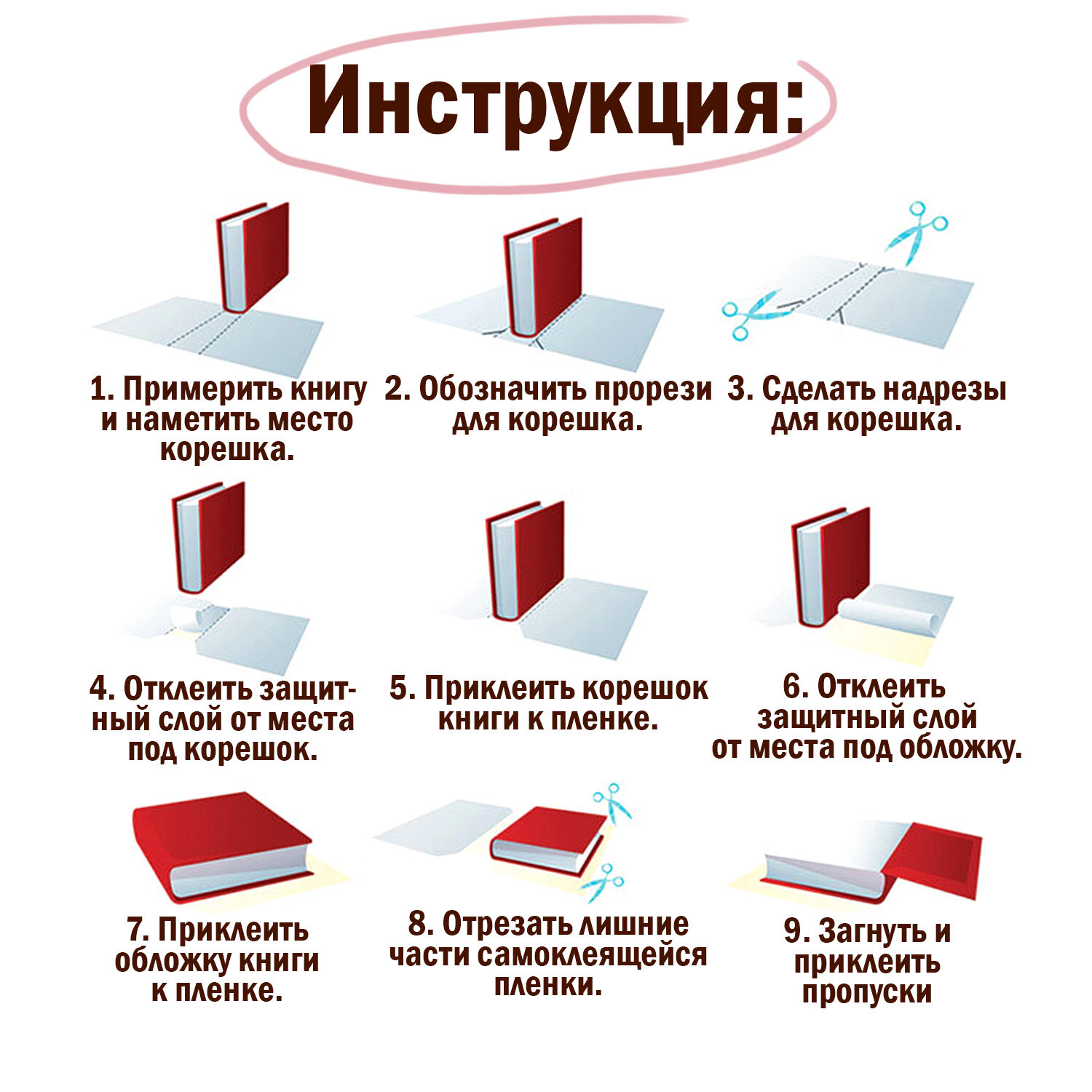 Изготовлена из прозрачного полипропилена толщиной 80 мкм. Подходит для любых форматов. Имеет глянцевый блеск. Рулон шириной 33 см и длиной 100 см.Инструкция по применению:1. Примерить книгу и наметить место корешка.2. Обозначить прорези для корешка. 3. Сделать надрезы для корешка.4. Отклеить защитный слой от места под корешок.5. Приклеить корешок книги к пленке.6. Отклеить защитный слой от места под обложку.7. Приклеить обложку книги к пленке.8. Отрезать лишние части самоклеящейся пленки.9. Загнуть и приклеить пропуски.