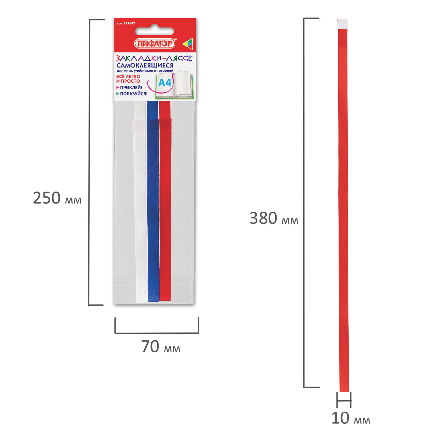Закладки-ляссе "ТРИКОЛОР" для книг А4 (длина 38 см) ПИФАГОР, клейкий край, 3 ленты, 111647