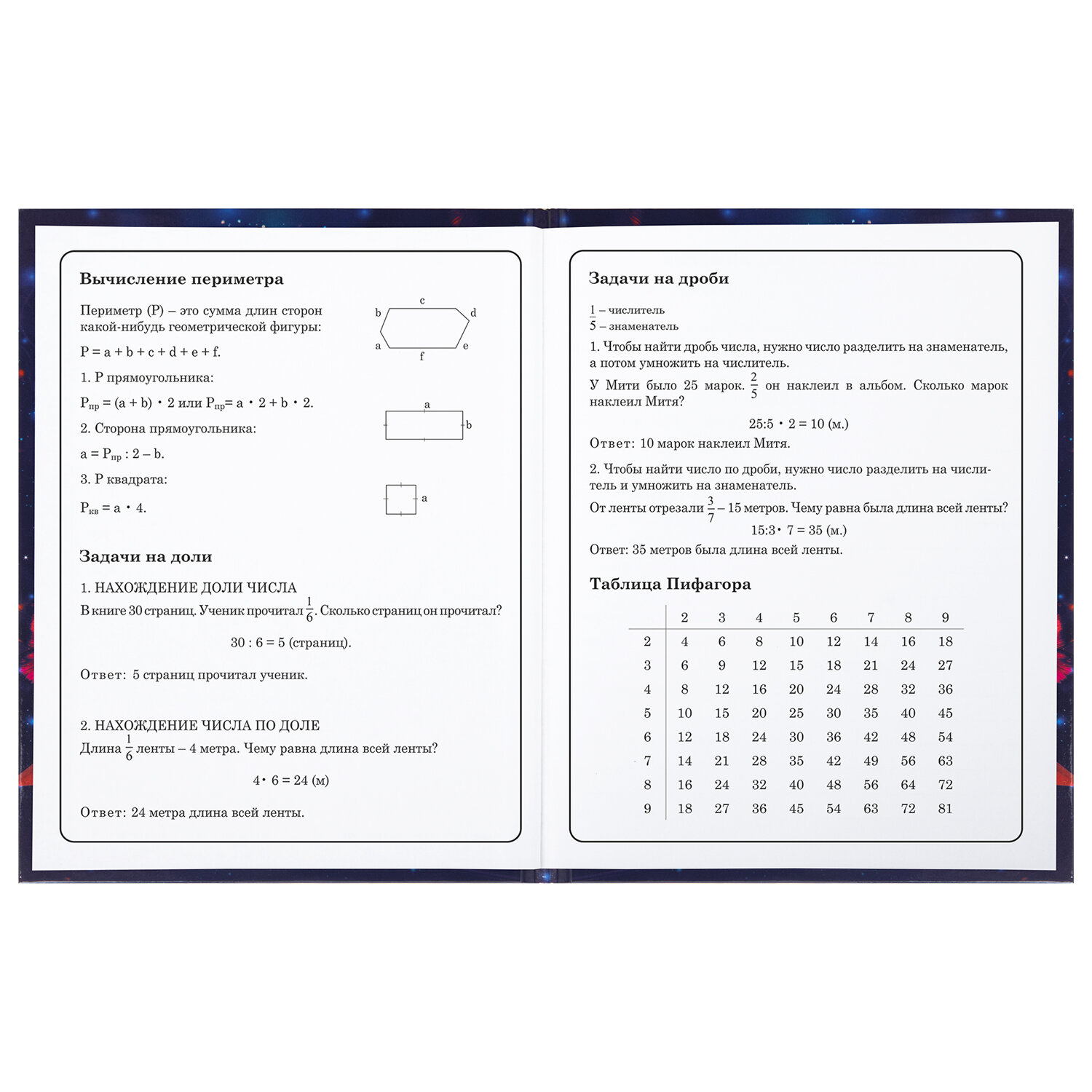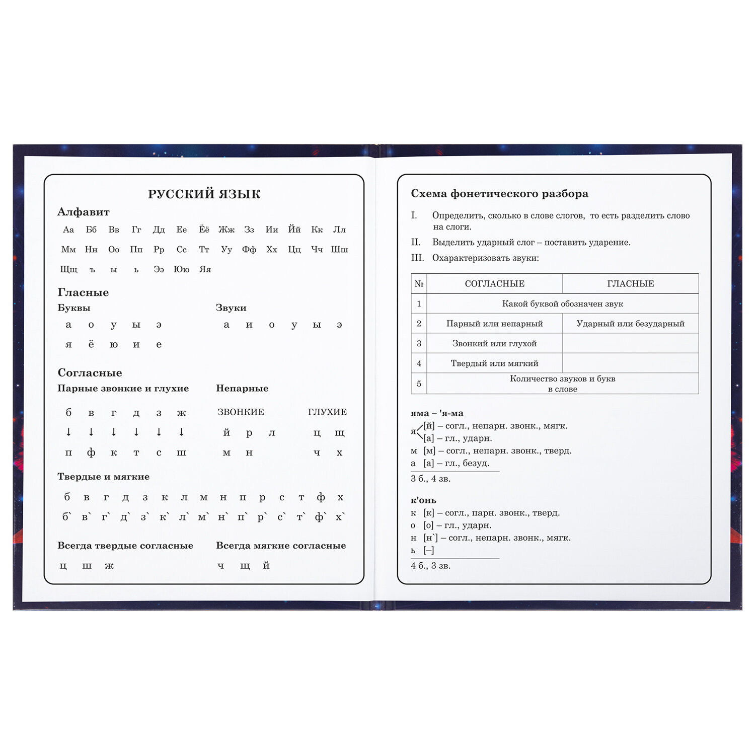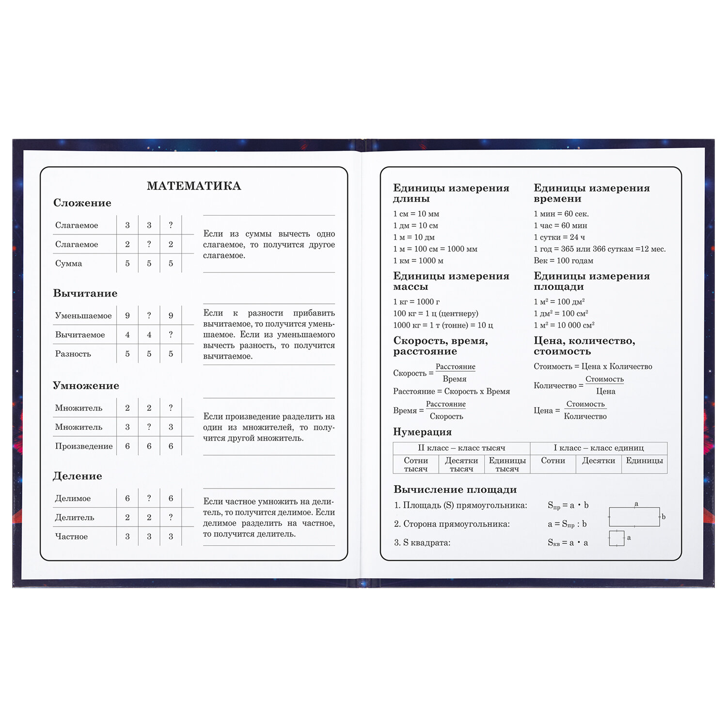 Предназначен для учащихся начальных классов. Твердая обложка надежно защищает бумагу и долго сохраняет привлекательный внешний вид. Благодаря глянцевой ламинации краски на изображении становятся более яркими и насыщенными, исключается возможное истирание рисунка. Внутренний блок содержит 48 листов и состоит из офсетной белой бумаги плотностью 60 г/м2. В справочном материале собраны основные подсказки для учащихся.