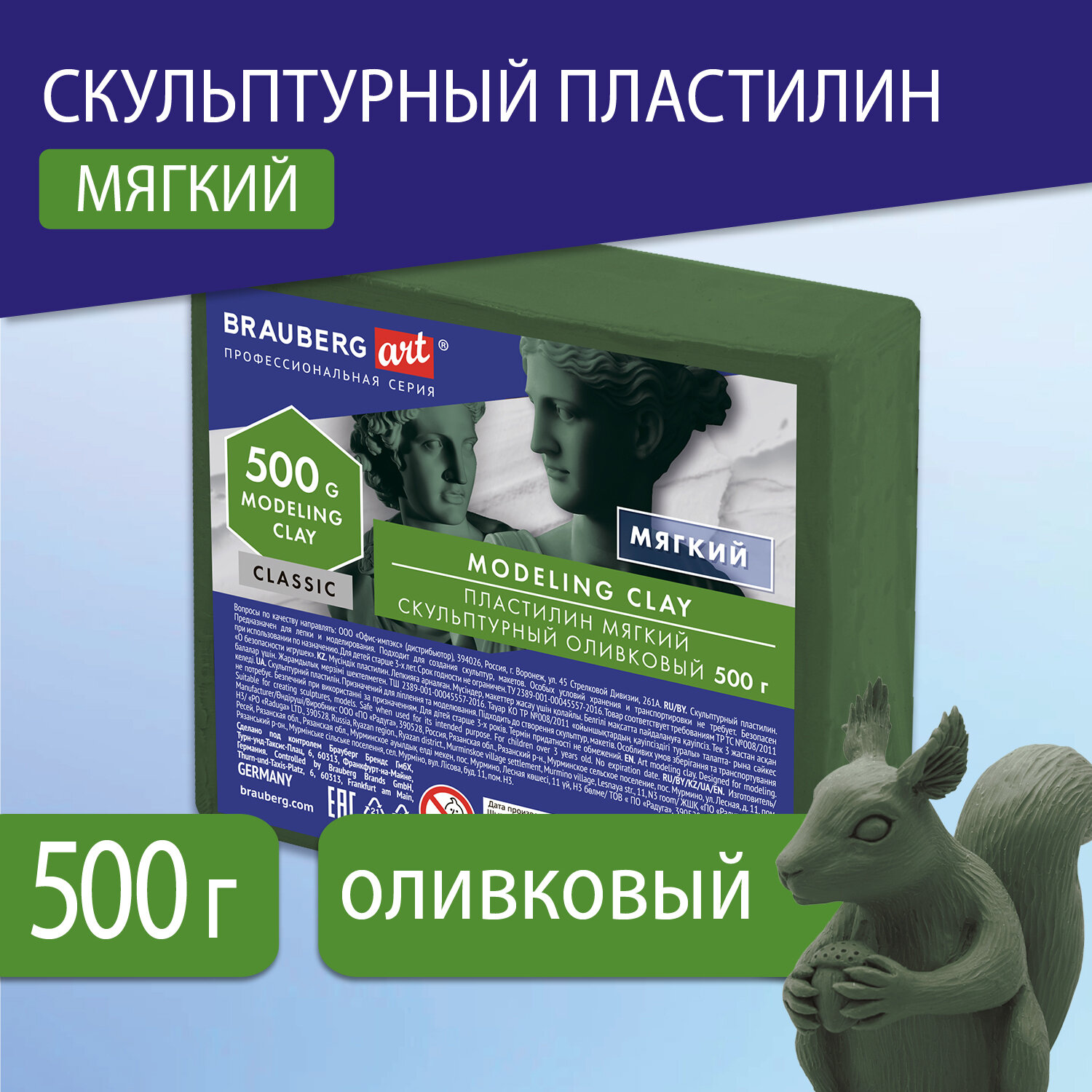 Отлично держит форму и устойчив к перепадам температуры. Не оставляет пятен, не липнет к рукам. Мягкий скульптурный пластилин подойдет начинающим любителям лепки и даже детям. Оптимальное для работы скульпторов соотношение мягкости и твердости материала, хорошая пластичность, естественные цвета. Пластилин весом 0,5 кг упакован в полипропиленовую пленку.Преимущества:- эластичный, податливый;- не оставляет после себя размазанных следов;- легко раскатывается на твёрдой плоскости или в руках;- смыть пятна не составляет труда, специальными средствами выводить не нужно, достаточно воды и мыла;- после того как пластилину придали форму какой-то фигуры, он не застывает, не крошится, эластичность не пропадает.
