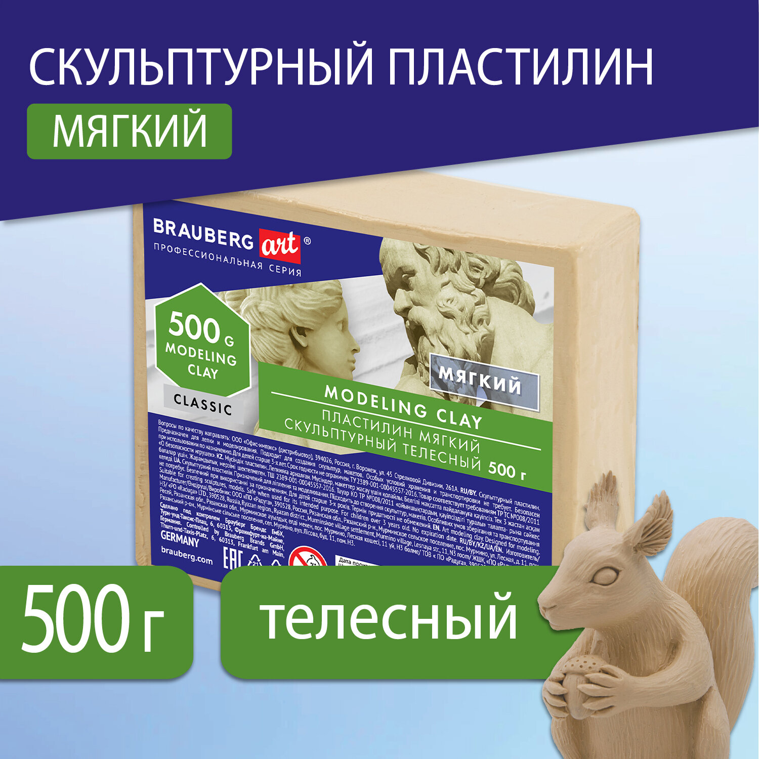 Отлично держит форму и устойчив к перепадам температуры. Не оставляет пятен, не липнет к рукам. Мягкий скульптурный пластилин подойдет начинающим любителям лепки и даже детям. Оптимальное для работы скульпторов соотношение мягкости и твердости материала, хорошая пластичность, естественные цвета. Пластилин весом 0,5 кг упакован в полипропиленовую пленку.Преимущества:- эластичный, податливый;- не оставляет после себя размазанных следов;- легко раскатывается на твёрдой плоскости или в руках;- смыть пятна не составляет труда, специальными средствами выводить не нужно, достаточно воды и мыла;- после того как пластилину придали форму какой-то фигуры, он не застывает, не крошится, эластичность не пропадает.